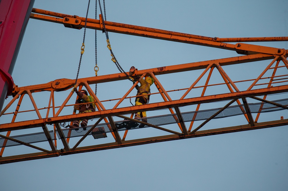 Description: Klöverns projekt Tele2s blivande huvudkontor - demontering av kranarm där en del är ca 27 m och väger ca 13 ton